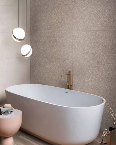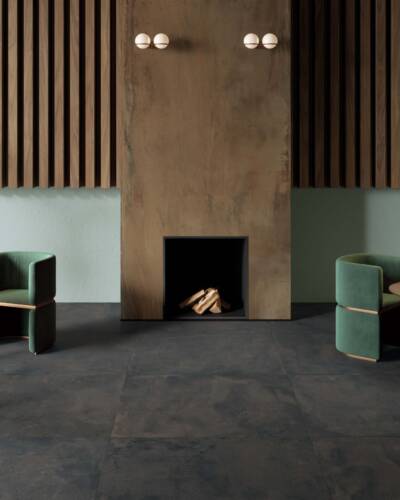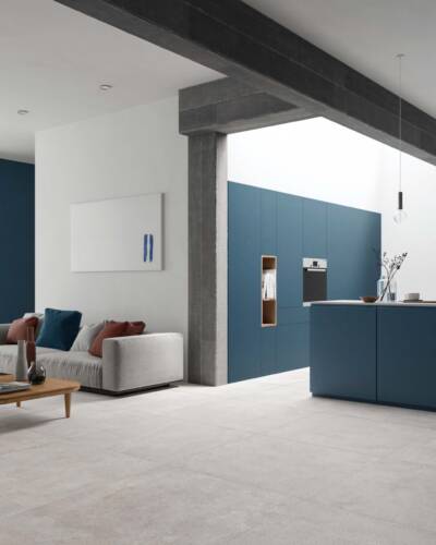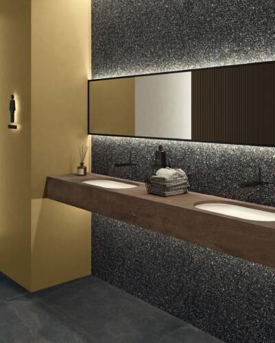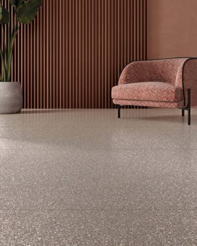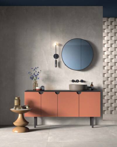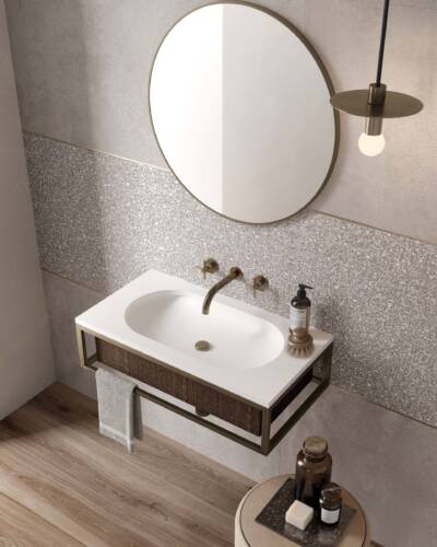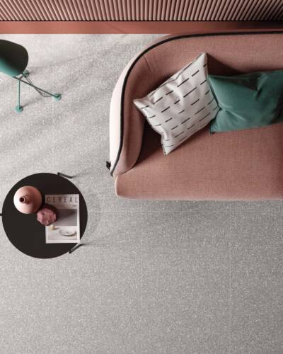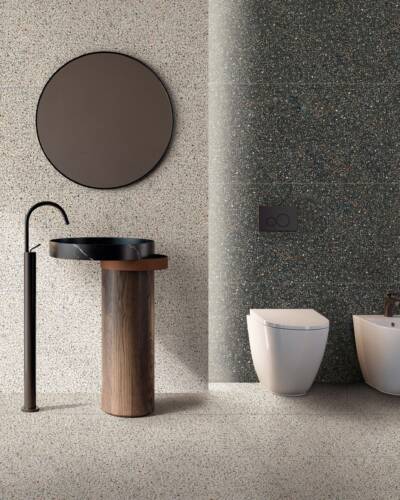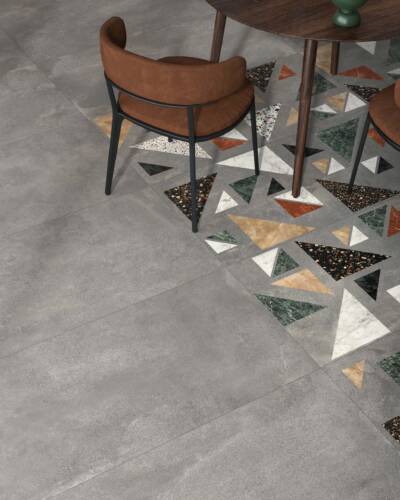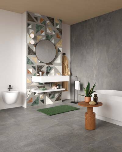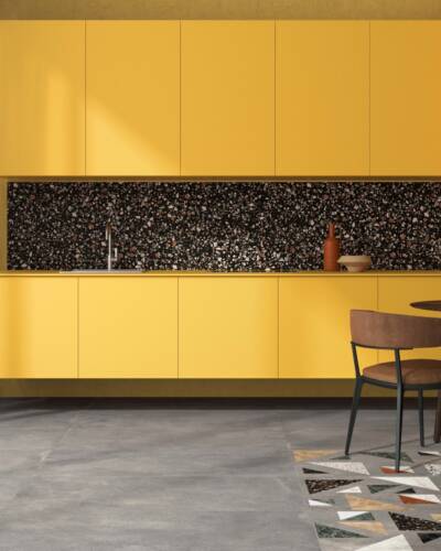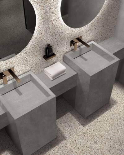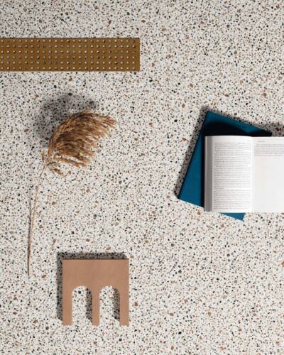 The industrial look of concrete meets the multicoloured textures of terrazzo in a decidedly contemporary compositional mix.