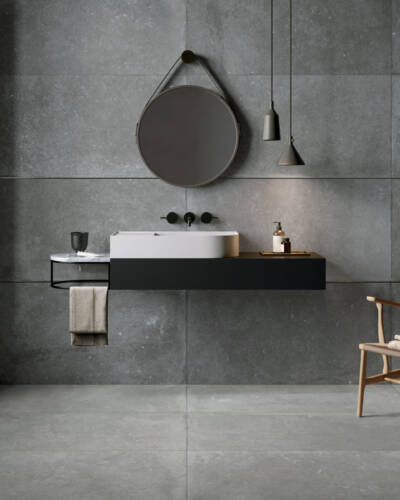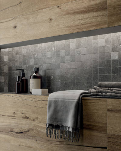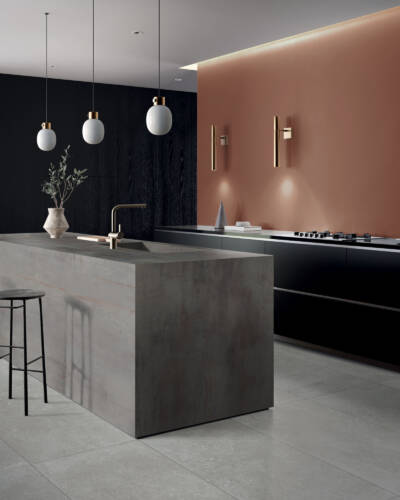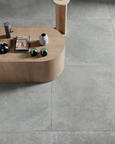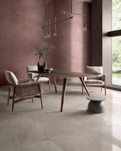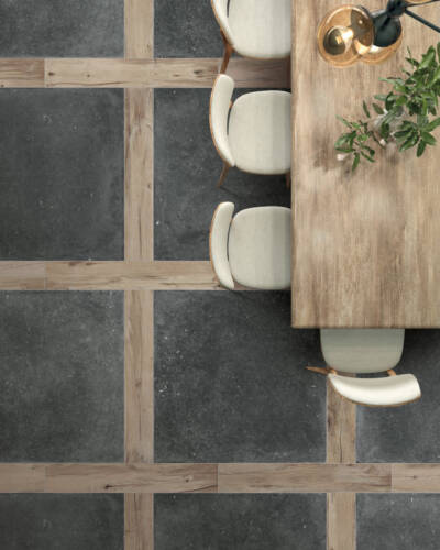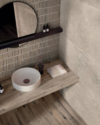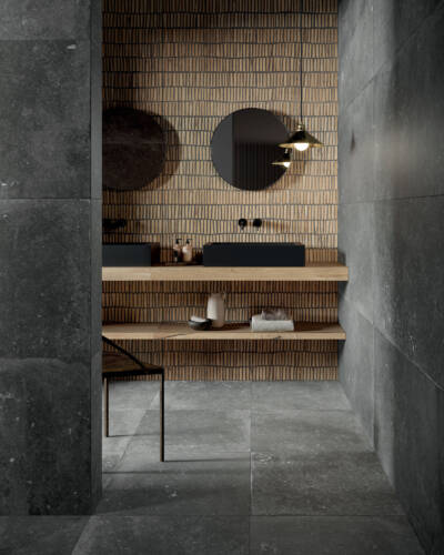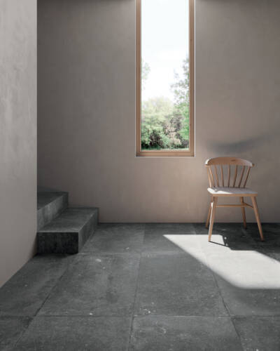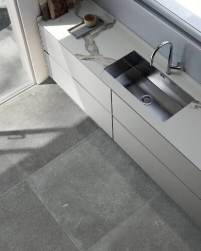 The texture of NORDIK is inspired by sedimentary rocks such as Belgian stone and shellstones. The presence of subtle contrasting veins, fossils and antique effects enhances its appearance, giving it a rustic-chic look that fits in well with more characteristic surfaces such as wood, concrete and industrial-inspired metal effects.